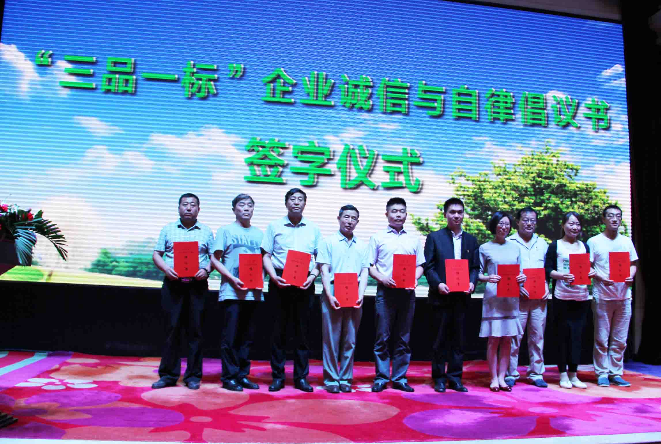 會上,與會企業(yè)代表聯(lián)名簽署了《“三品一標”企業(yè)誠信與自律倡議書》,承諾將誠信經(jīng)營,自覺履行產(chǎn)品質(zhì)量安全第一責任人的法定責任,共同確?!吧嗉馍系陌踩?,協(xié)會副會長單位、內(nèi)蒙古蒙都羊業(yè)公司董事長許錄代表簽約企業(yè)宣讀倡議書。