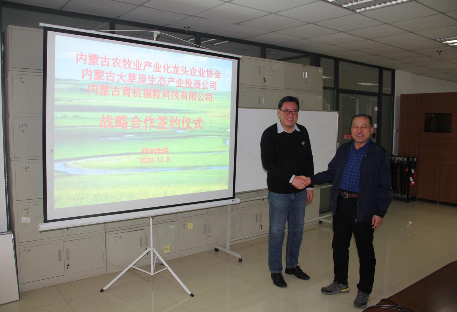 2020年12月8日,內(nèi)蒙古農(nóng)牧業(yè)產(chǎn)業(yè)化龍頭企業(yè)協(xié)會(huì)執(zhí)行會(huì)長(zhǎng)林永亮一行到內(nèi)蒙古青杭福粒科技有限公司交流考察,并與大草原生態(tài)產(chǎn)業(yè)投資有限公司董事長(zhǎng)李剛簽署戰(zhàn)略合作協(xié)議。
