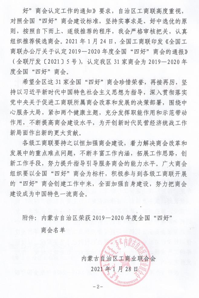 工商聯(lián)所屬商會(huì)是做好民營經(jīng)濟(jì)統(tǒng)戰(zhàn)工作的重要組織依托。為深入推進(jìn)工商聯(lián)所屬商會(huì)改革發(fā)展,持續(xù)深化“四好”商會(huì)建設(shè),全國工商聯(lián)組織開展了20192020年度全國“四好”商會(huì)認(rèn)定工作,經(jīng)過嚴(yán)格的推薦、初審以及專家評審組評審等環(huán)節(jié),日前認(rèn)定了1478家全國“四好”商會(huì)。內(nèi)蒙古農(nóng)牧業(yè)產(chǎn)業(yè)化龍頭企業(yè)協(xié)會(huì)榮獲全國“四好”商會(huì)榮譽(yù)稱號。
