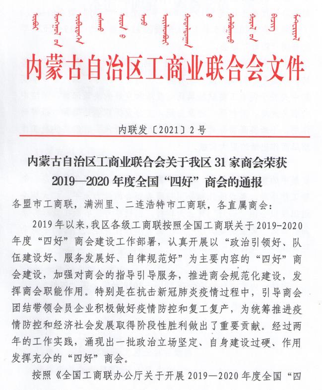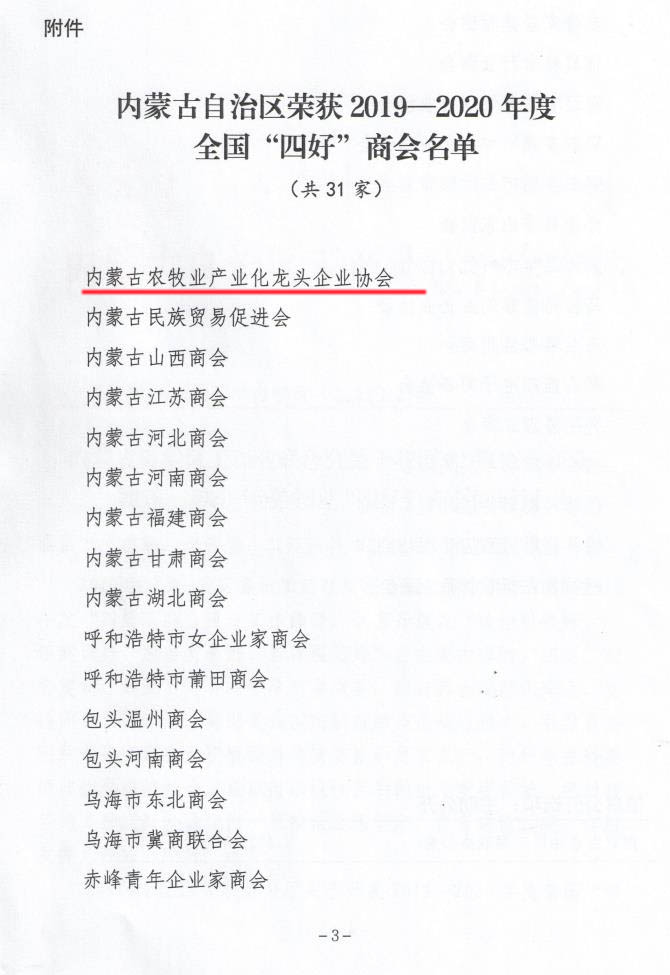 標(biāo)題:喜報(bào)!內(nèi)蒙古農(nóng)牧業(yè)產(chǎn)業(yè)化龍頭企業(yè)協(xié)會(huì)榮獲全國“四好”商會(huì)榮譽(yù)稱號