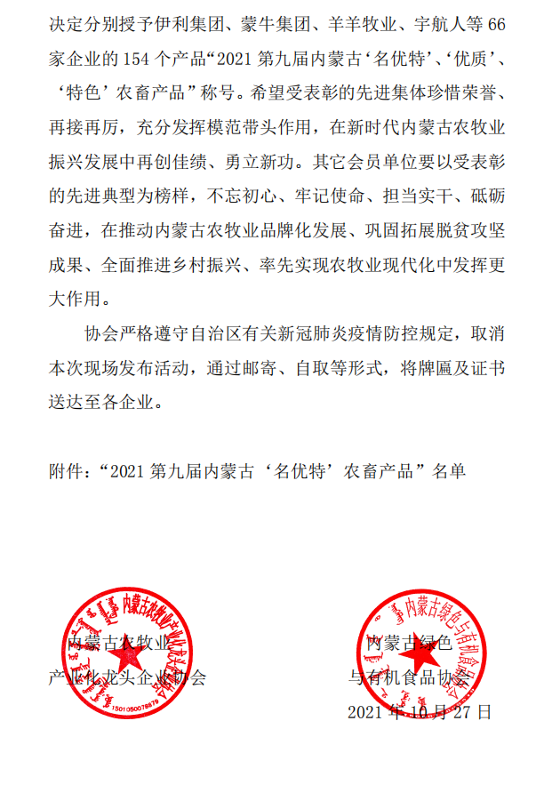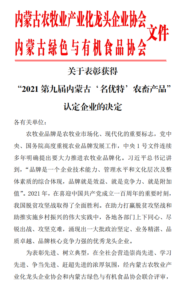 標(biāo)題:關(guān)于表彰獲得 “2021第九屆內(nèi)蒙古‘名優(yōu)特’農(nóng)畜產(chǎn)品”認(rèn)定企業(yè)的決定