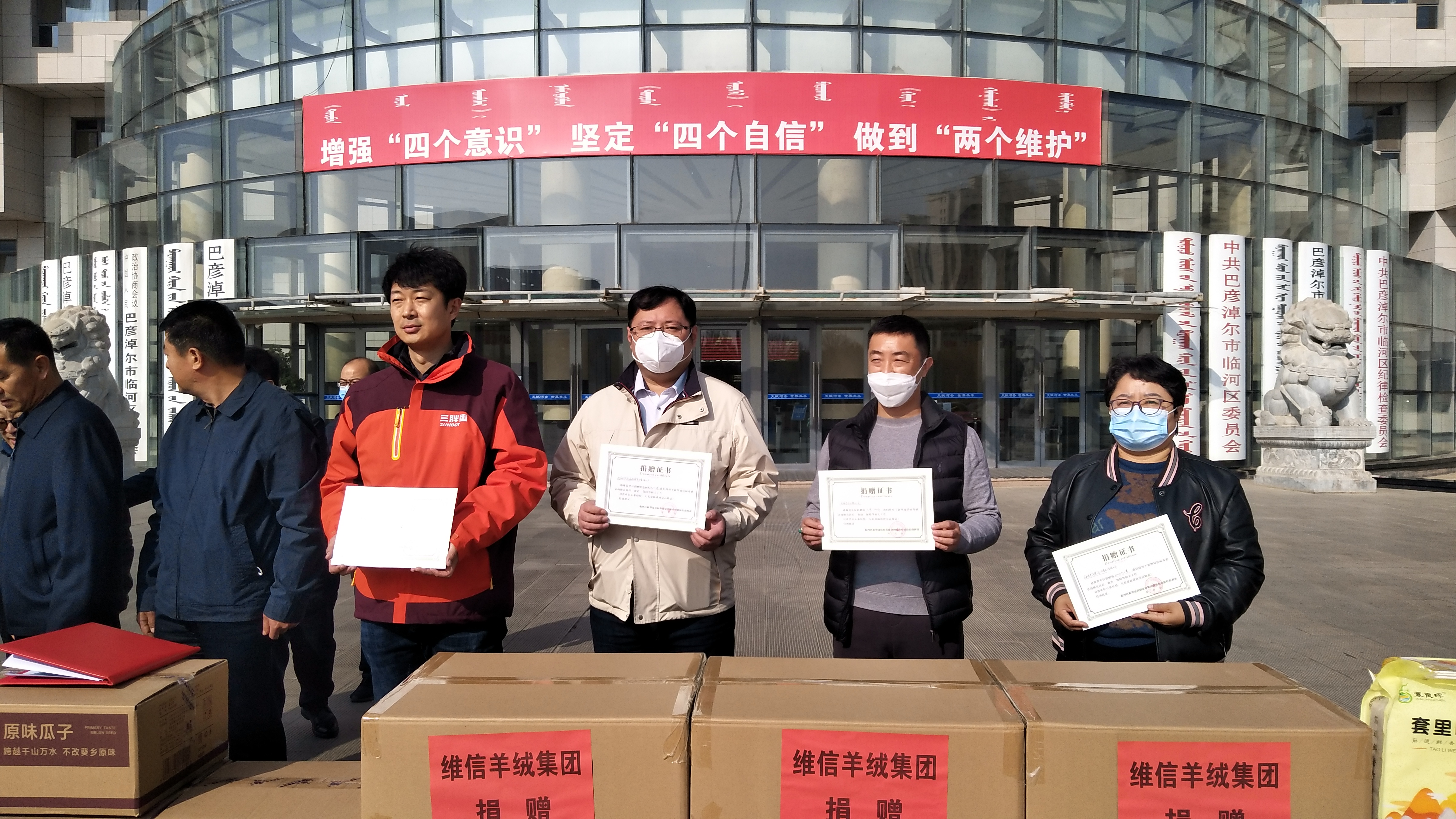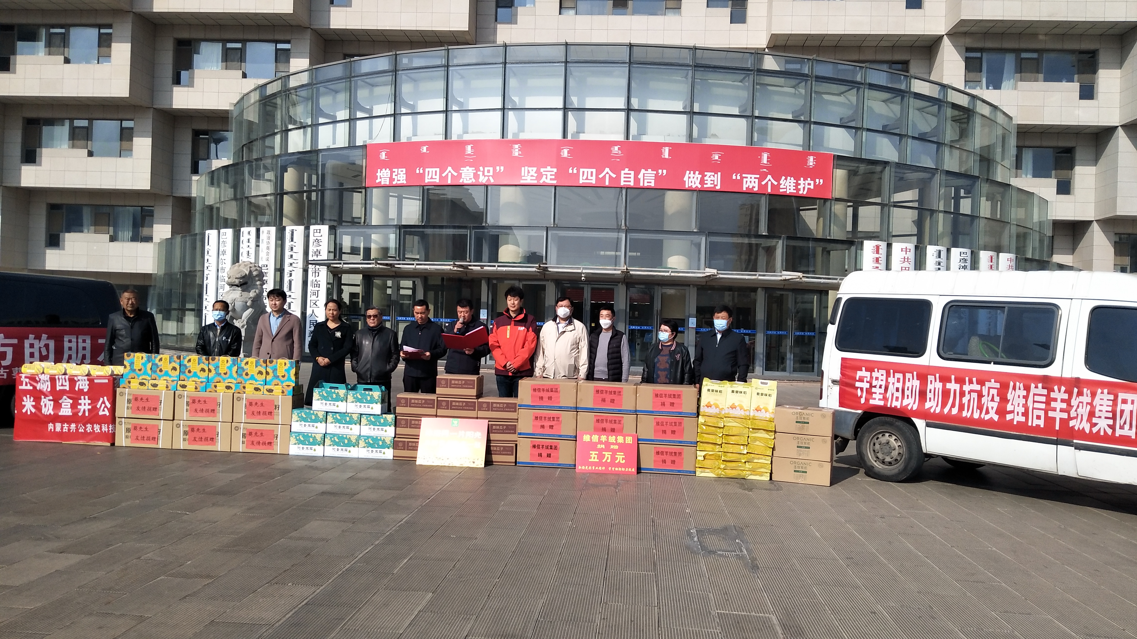 11月5日中午,維信羊絨集團等7家會員單位向巴彥淖爾市臨河區(qū)抗疫捐贈物資,捐贈儀式在臨河區(qū)政府辦公樓前舉行,區(qū)委副書記、政法委書記陳海維參加活動并講話,對愛心企業(yè)的高尚情操給與了高度評價,區(qū)政協(xié)副主席劉浩主持了捐贈儀式。