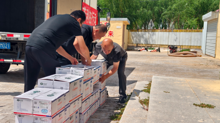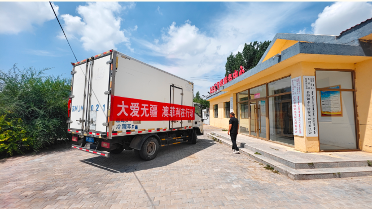捐贈現(xiàn)場,一輛懸掛“大愛無疆 澳菲利在行動”紅色條幅的冷鏈車緩緩駛?cè)胩缀f?zhèn)永生村村委會,車剛停穩(wěn),工作人員迅速將一箱箱羊肉產(chǎn)品搬下車,整齊碼放在村委會門口,現(xiàn)場暖意涌動。