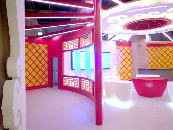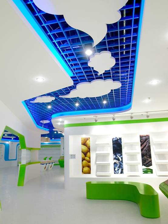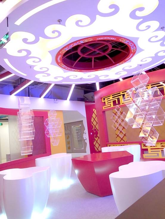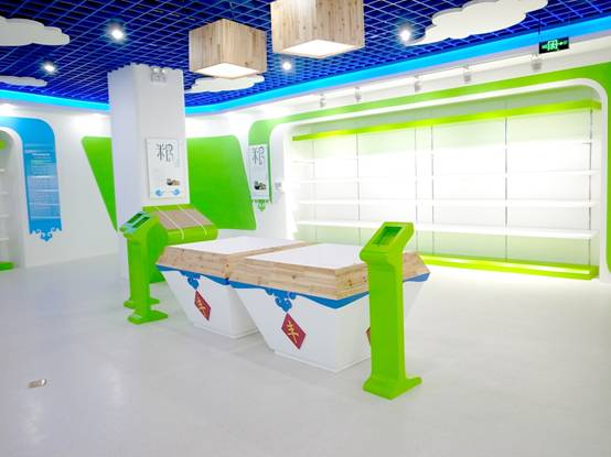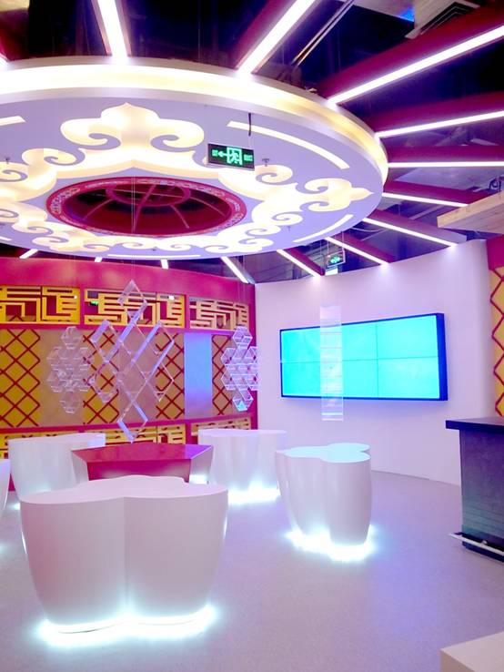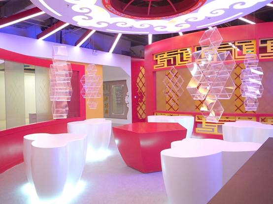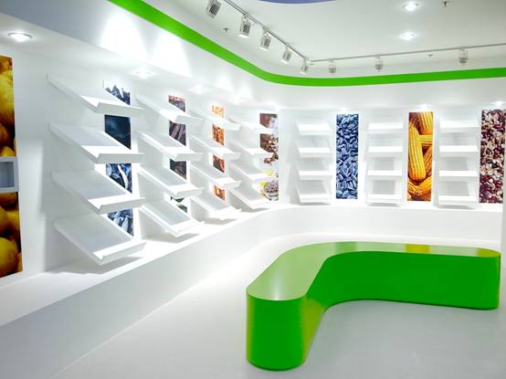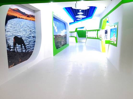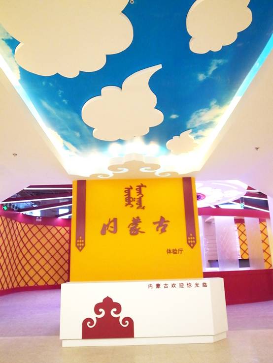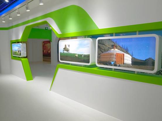 : 上海西郊國際內(nèi)蒙古館現(xiàn)場實(shí)景圖,現(xiàn)場分為展示區(qū)和體驗(yàn)區(qū),展示區(qū)以產(chǎn)品展示銷售為主,現(xiàn)代科技結(jié)合時(shí)尚展廳設(shè)計(jì)風(fēng)格,藍(lán)綠白相結(jié)合,映襯藍(lán)天、白云、草原;體驗(yàn)區(qū)突出體驗(yàn)品嘗、商務(wù)洽談功能,以現(xiàn)代蒙古包造型設(shè)計(jì),突出民族氣息,展現(xiàn)內(nèi)蒙古特色。