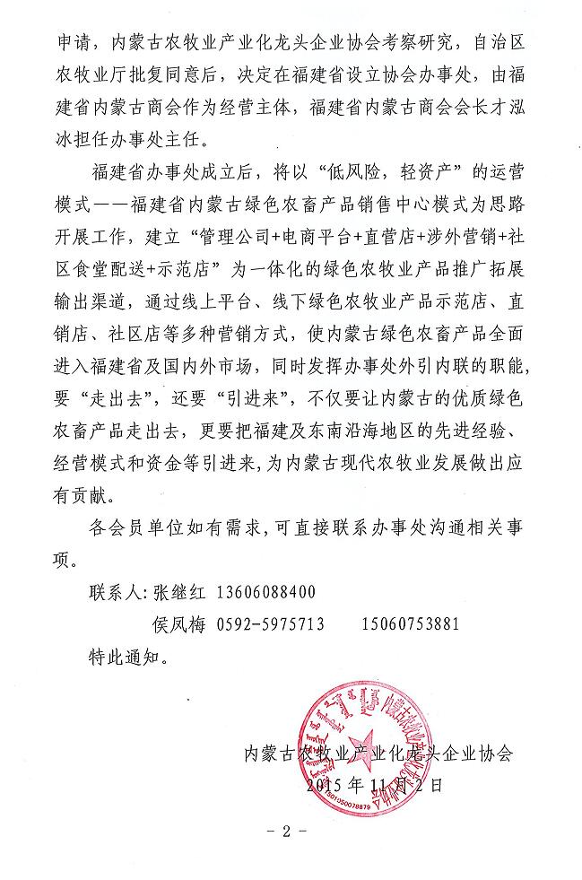 關(guān)于成立內(nèi)蒙古農(nóng)牧業(yè)產(chǎn)業(yè)化龍頭企業(yè)協(xié)會福建省辦事處的通知