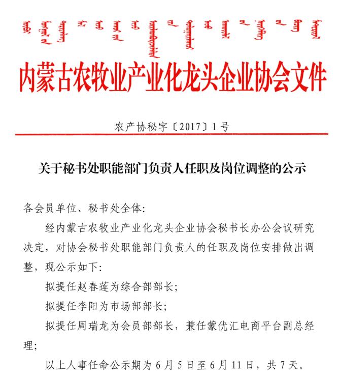 關(guān)于秘書處職能部門負(fù)責(zé)人任職及崗位調(diào)整的公示