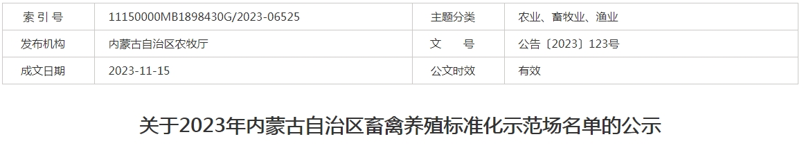 標題:關(guān)于2023年內(nèi)蒙古自治區(qū)畜禽養(yǎng)殖標準化示范場名單的公示